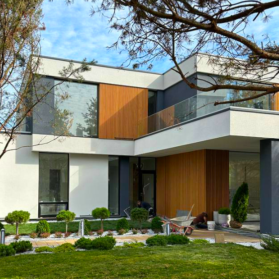 Фасад частного дома оформлен декоративной рейкой 60×37 мм под дерево Орех Миланский. Благодаря современному 3D‑покрытию Принтек поверхность максимально реалистично имитирует натуральную текстуру древесины и при этом устойчива к внешним воздействиям. Такой материал не только придаёт зданию современный и стильный облик, но и обеспечивает долговечность отделки, сохраняя насыщенный цвет и фактуру на долгие годы.